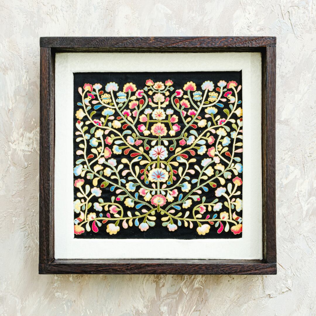 ダークブラウンの木製額に映える色とりどりの刺繍は、